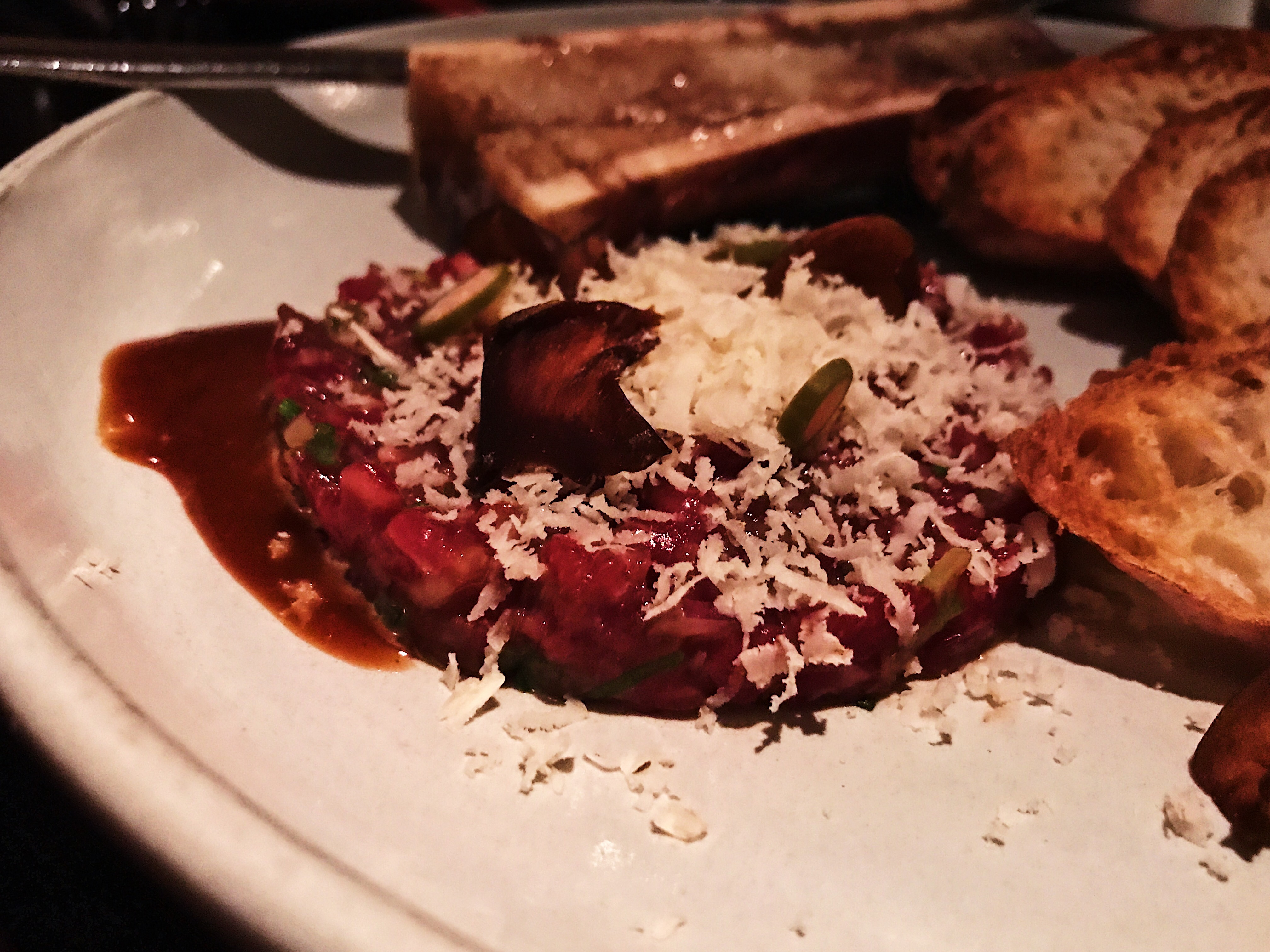 The second highlight of the night was this Beef Tartar. Even till today, I still can’t forget the rich and complex feeling I had in my mouth. It was like an orchestra, the dish mixed ingredients from different categories: beef, red miso, roasted bone marrow, crispy Maitake mushroom and horseradish. There were so many components, but as you put everything on a piece of bread and bite into it, you can feel the harmonious marriage of all ingredients and experience a complex and sensational explosion of flavors in your mouth. It was extremely creamy, buttery and savory.